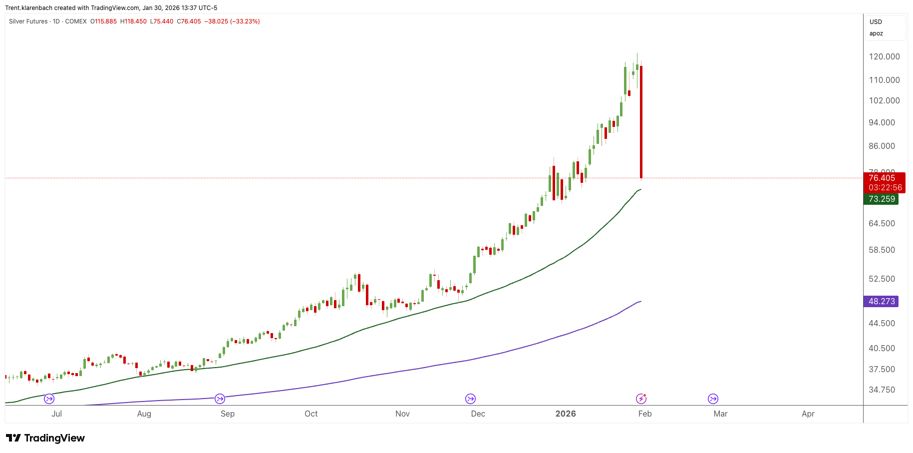 Silver is down 33% for the day.